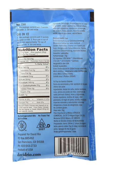 David Rio Elephant Vanilla Chai Tea Latte Single Serve Packets - 12/Box