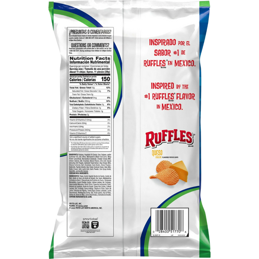 Ruffles Potato Chips Queso Cheese Flavored Snack Chips, Snacks, Large Bag 8 Ounce Bag