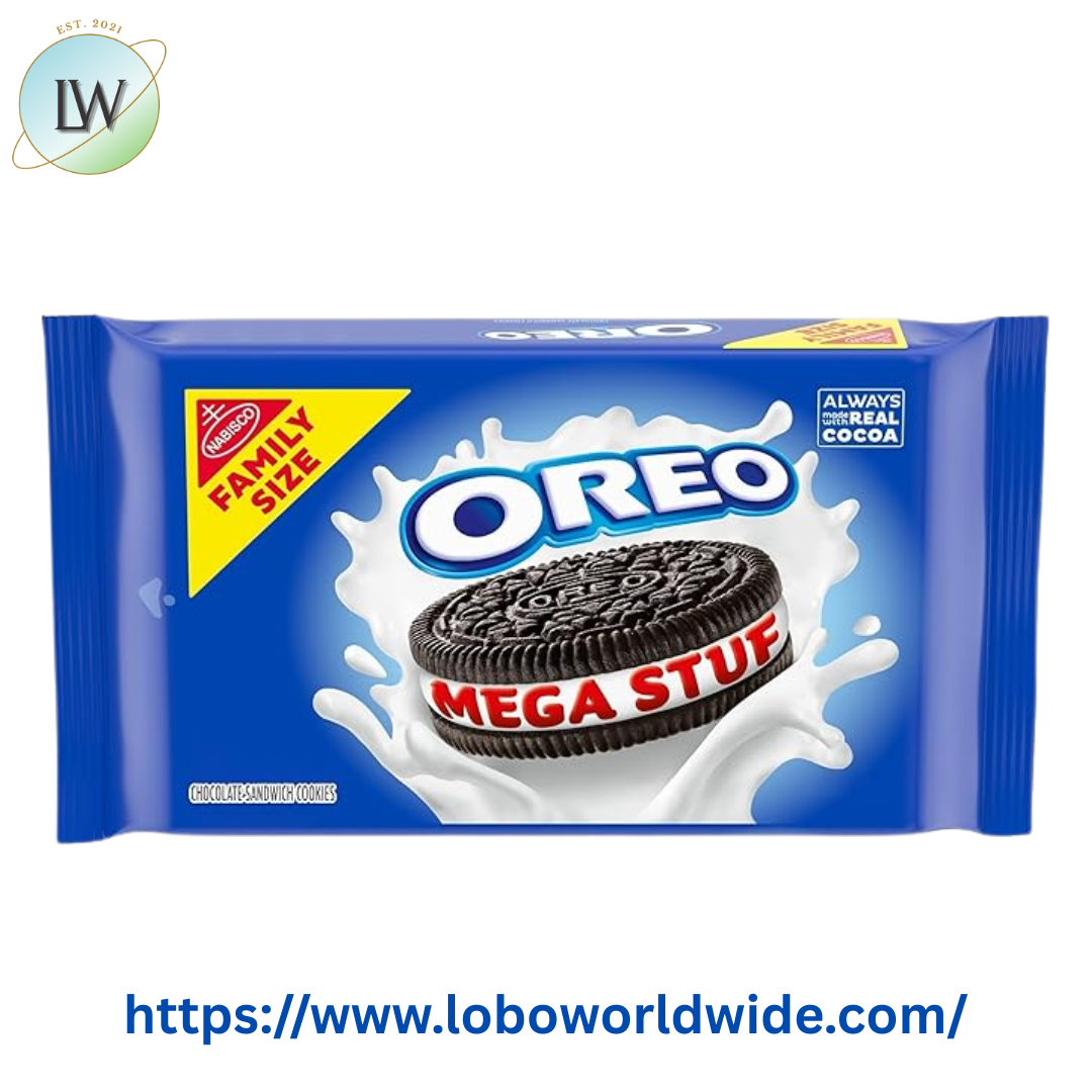 Includes three Family Size packs of OREO Mega Stuf Chocolate Sandwich Cookies.