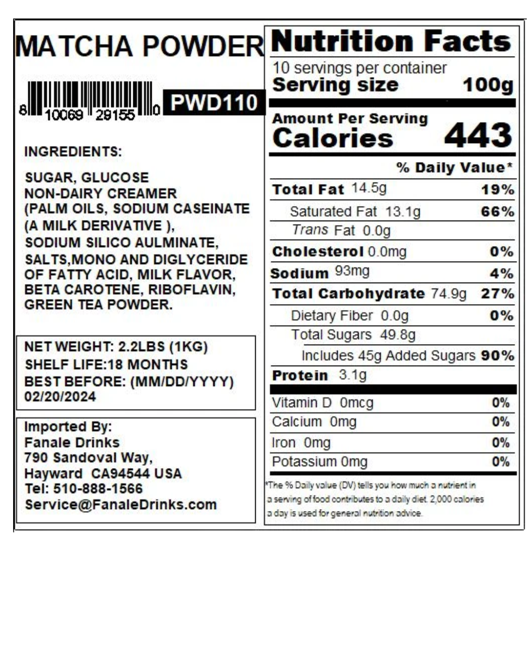 Fanale Matcha Green Tea Pure Powder Mix 2.2 lb.