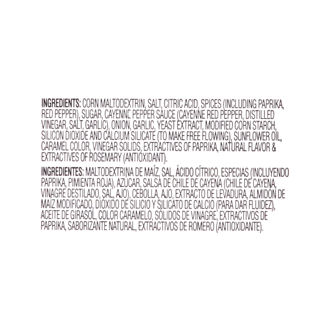 - Fiery blend of cayenne pepper, red pepper, sugar, paprika, vinegar, garlic, and onion