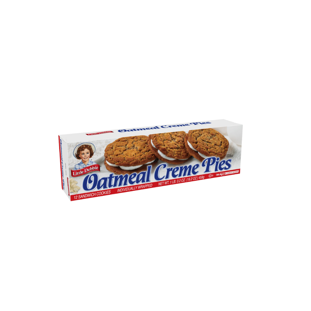 - (2) Two cartons of Oatmeal Creme Pies: Two soft oatmeal cookies layered with creme. Whole grain oats, molasses, and irresistible creme filling combine to create this classic treat.