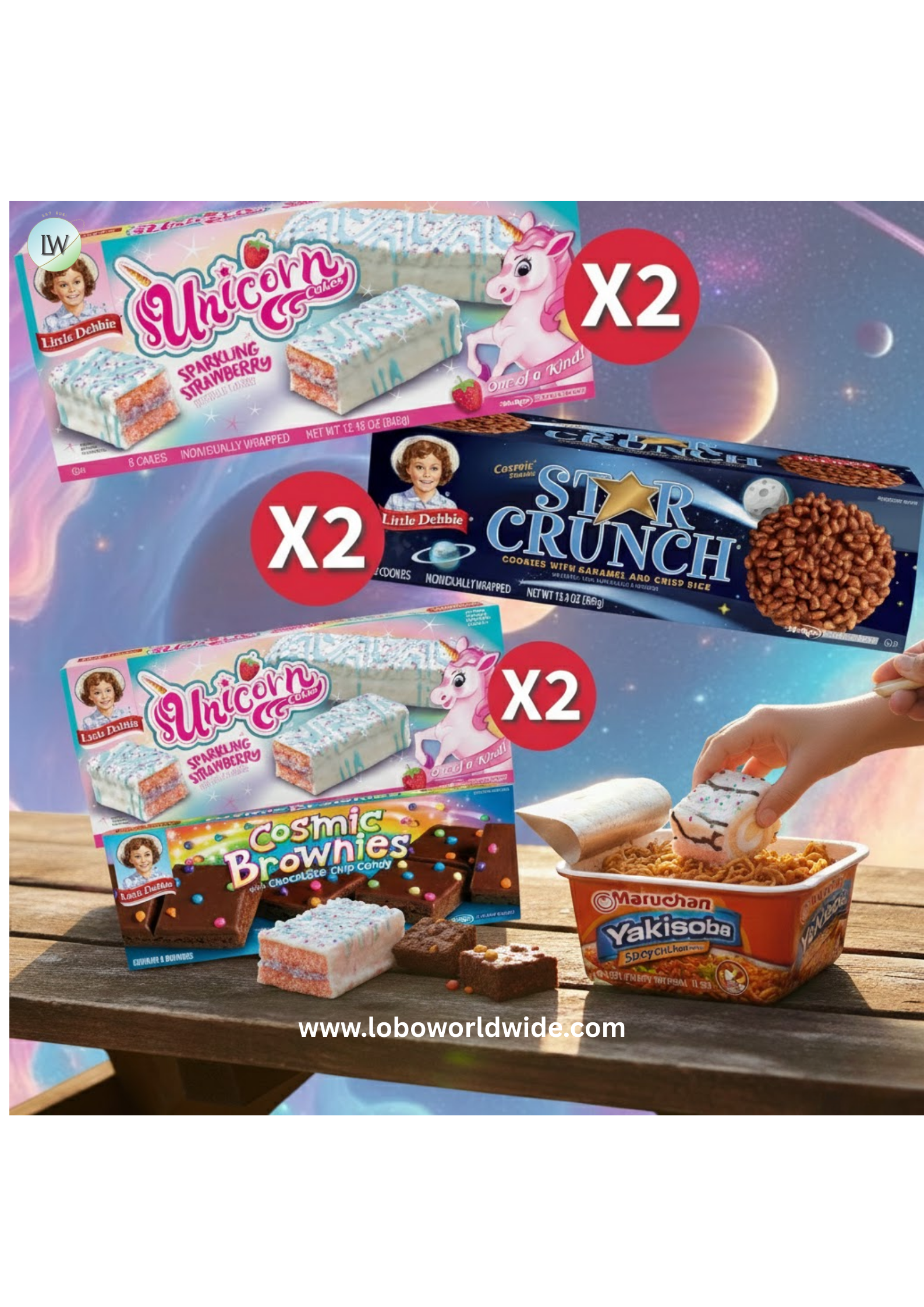 - Out of This World Bundle: Includes Cosmic Brownies, Zebra Cake Rolls, Star Crunch, and Unicorn Cakes (2 cartons each) – a fun, colorful mix perfect for kids, celebrations, and themed parties.