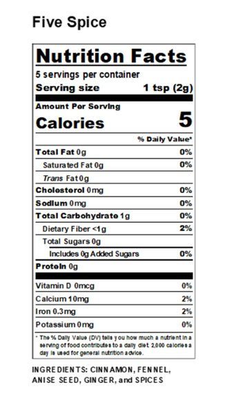 Authentic Chinese-inspired blend combining five classic spices — cinnamon, fennel, anise seed, ginger, and pepper.